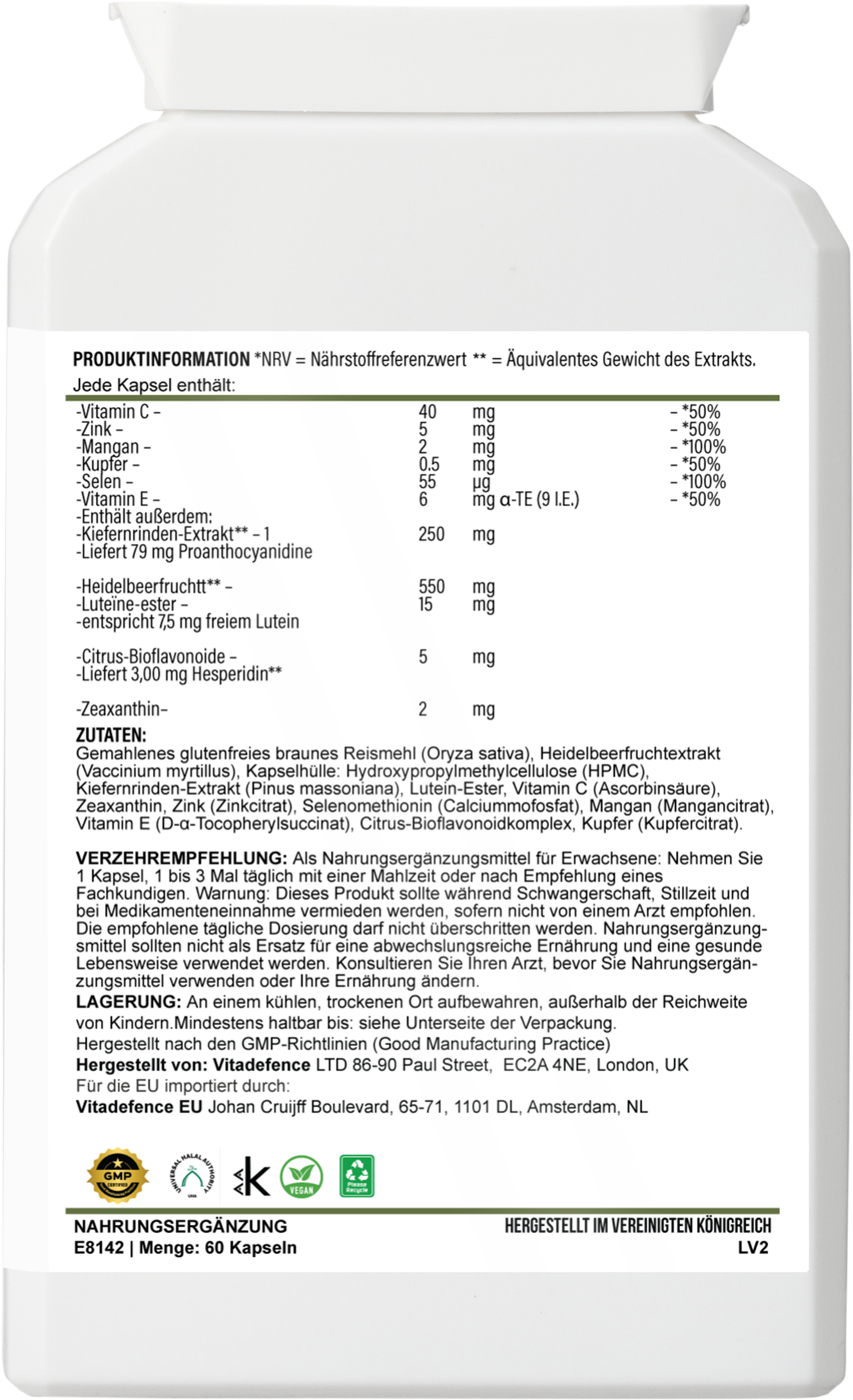 Vitadefence® Bilberry Multi is a vegan capsule food supplement, manufactured in the UK to GMP standards. This balanced formula combines bilberry with pine bark, lutein esters, and essential vitamins and minerals.