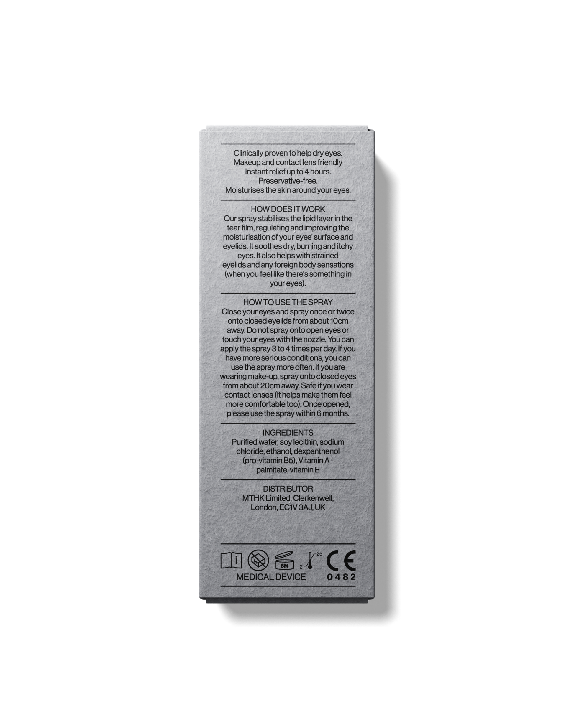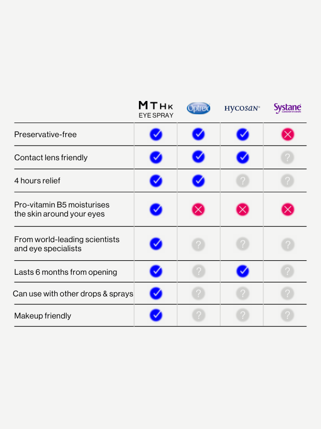 MTHK's Eye Spray is the next best thing to blinking and real tears. Developed by specialists at Moorfields Eye Hospital, it has no phosphates or preservatives, just the moisture your eyes need to stay healthy.