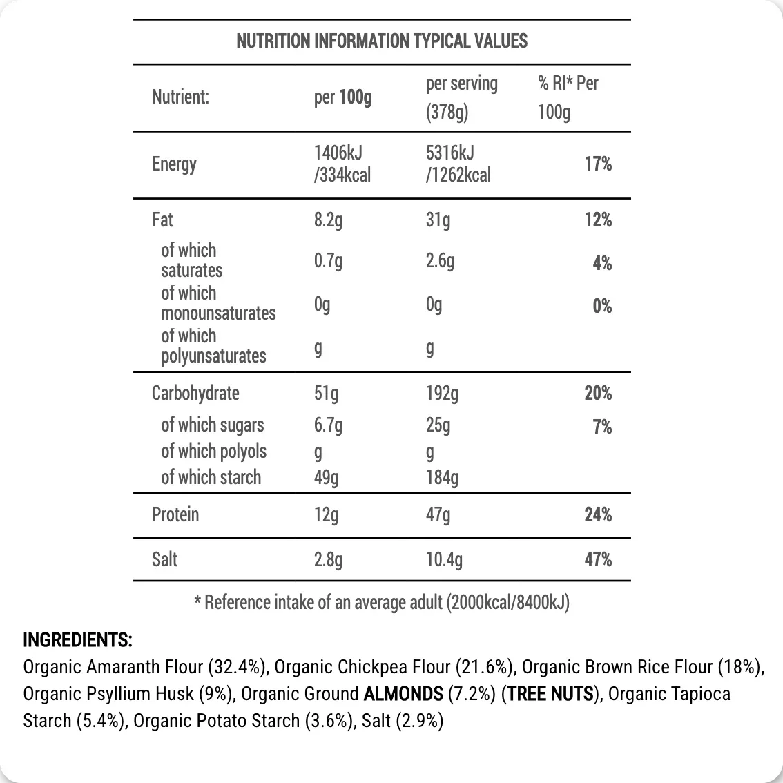 Amaranth flour, brown rice flour, chickpea flour, ground almond, psyllium husk, potato starch, tapioca starch and salt.