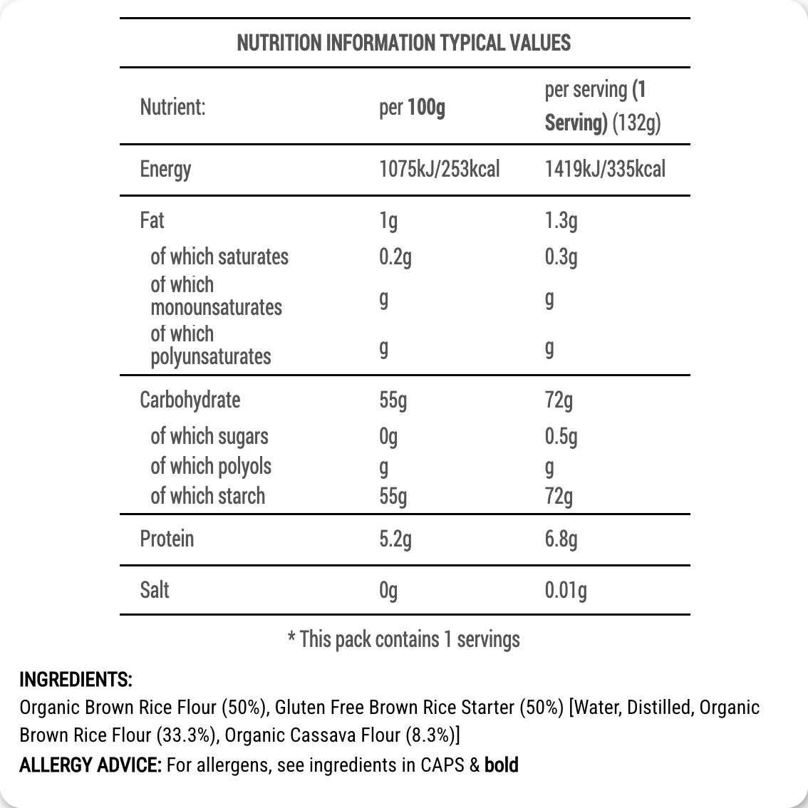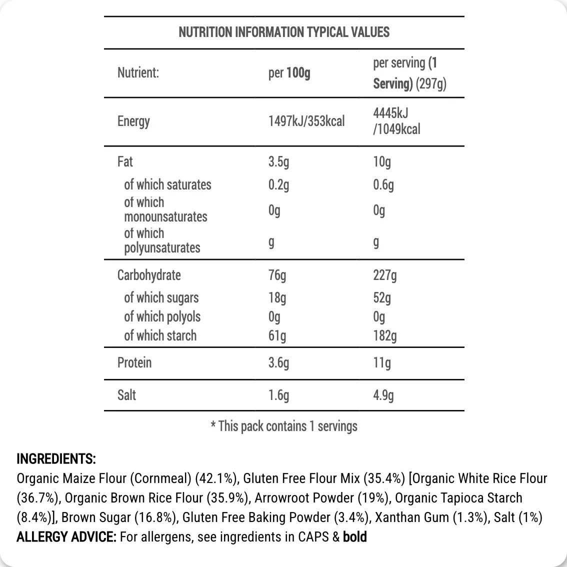 gluten-free flour mix (Organic Brown Rice Flour, Organic White Rice Flour, Arrowroot Powder, Organic Tapioca Starch), xanthan gum, Maize flour, brown sugar, Gluten-free baking powder, Salt