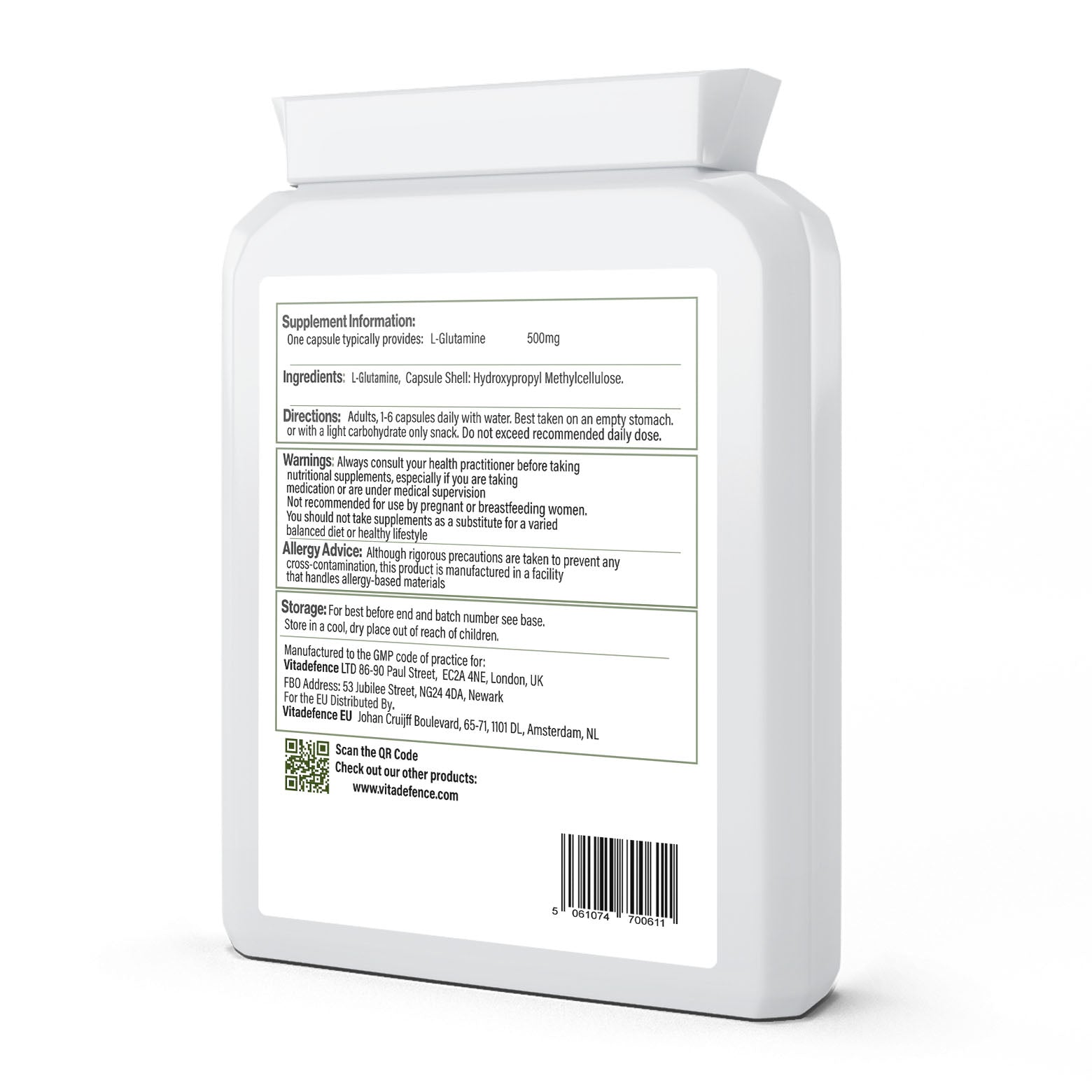 Vitadefence® L-Glutamine 2-Pack is a vegan capsule food supplement, manufactured in the UK to GMP standards. This value bundle provides 2 bottles of our pure formula, delivering 500mg of L-Glutamine per capsule, the most abundant amino acid in the human body.