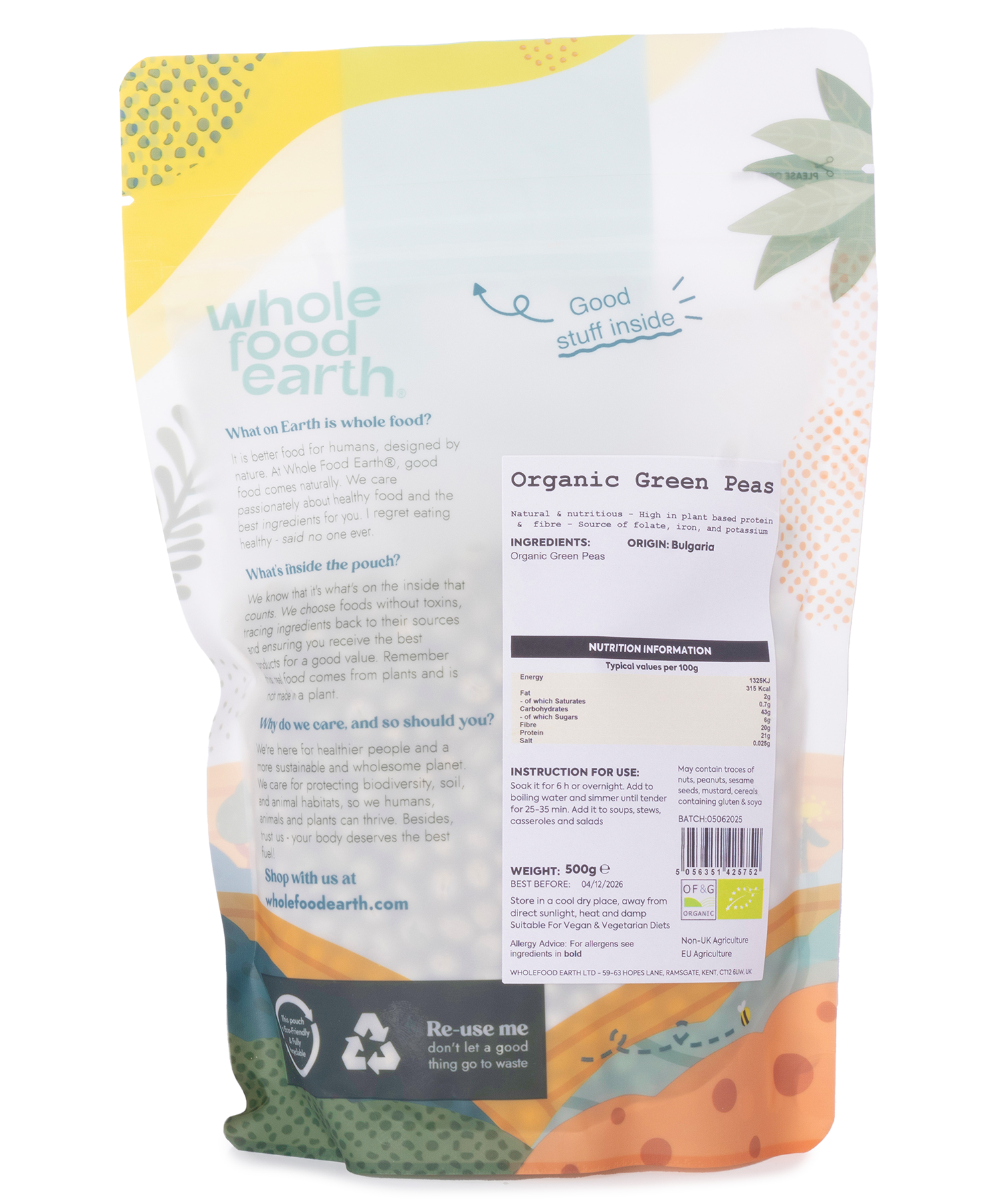 Organic Green Peas are a great source of plant-based protein and fibre. They are great to enhance your meals with wholesome goodness.