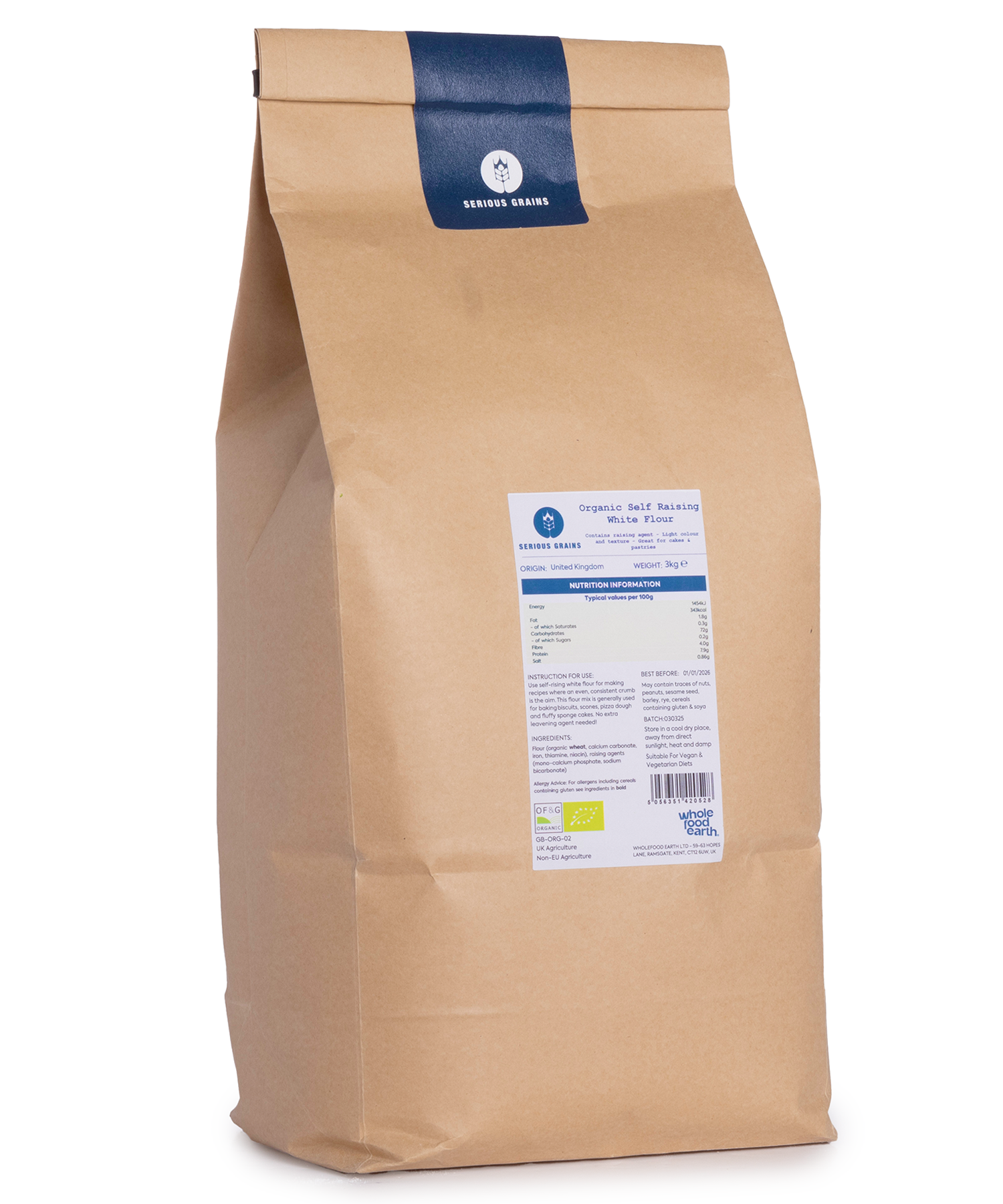 Ingredients: Organic flour (wheat, calcium carbonate, niacin, iron, folic acid, thiamine), raising agents (mono-calcium phosphate, sodium bicarbonate).