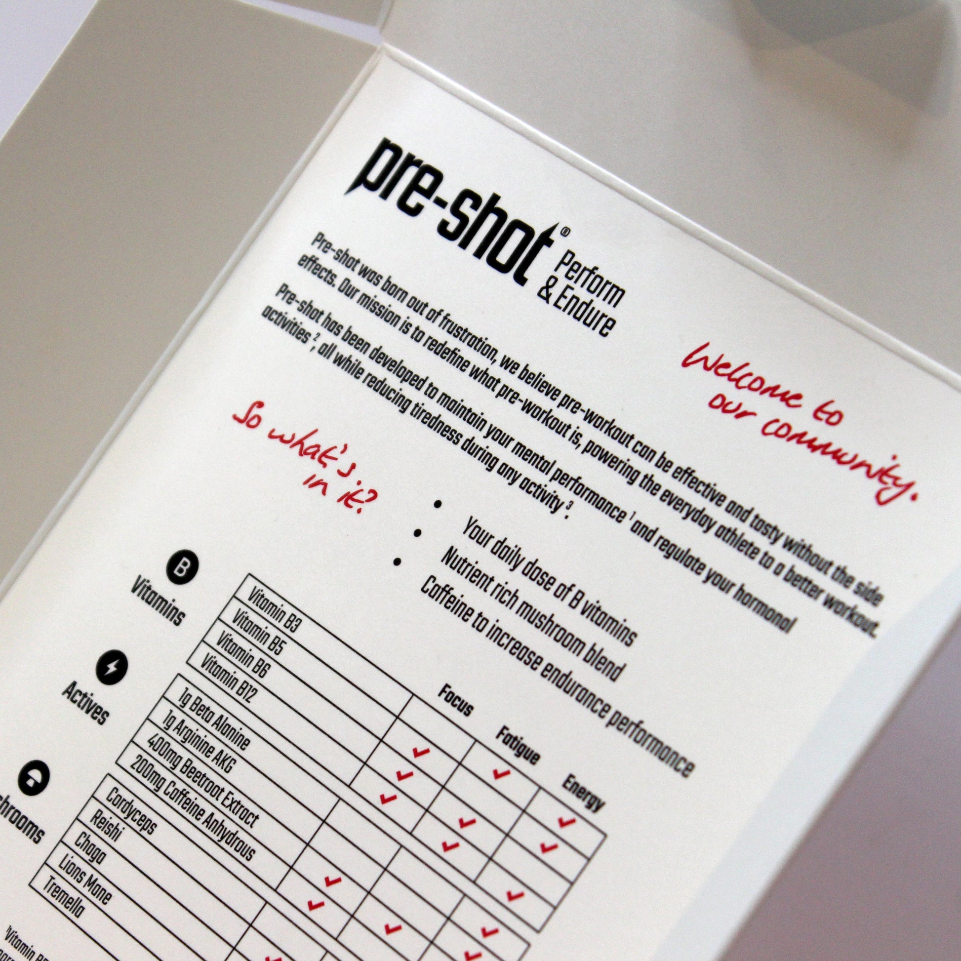 Pre-shot combines scientifically backed actives, mushrooms and vitamins to help increase physical energy, reduce fatigue and improve focus. Pre-shot is not your typical pre-workout, it targets body and mind, without side effects or energy crashes