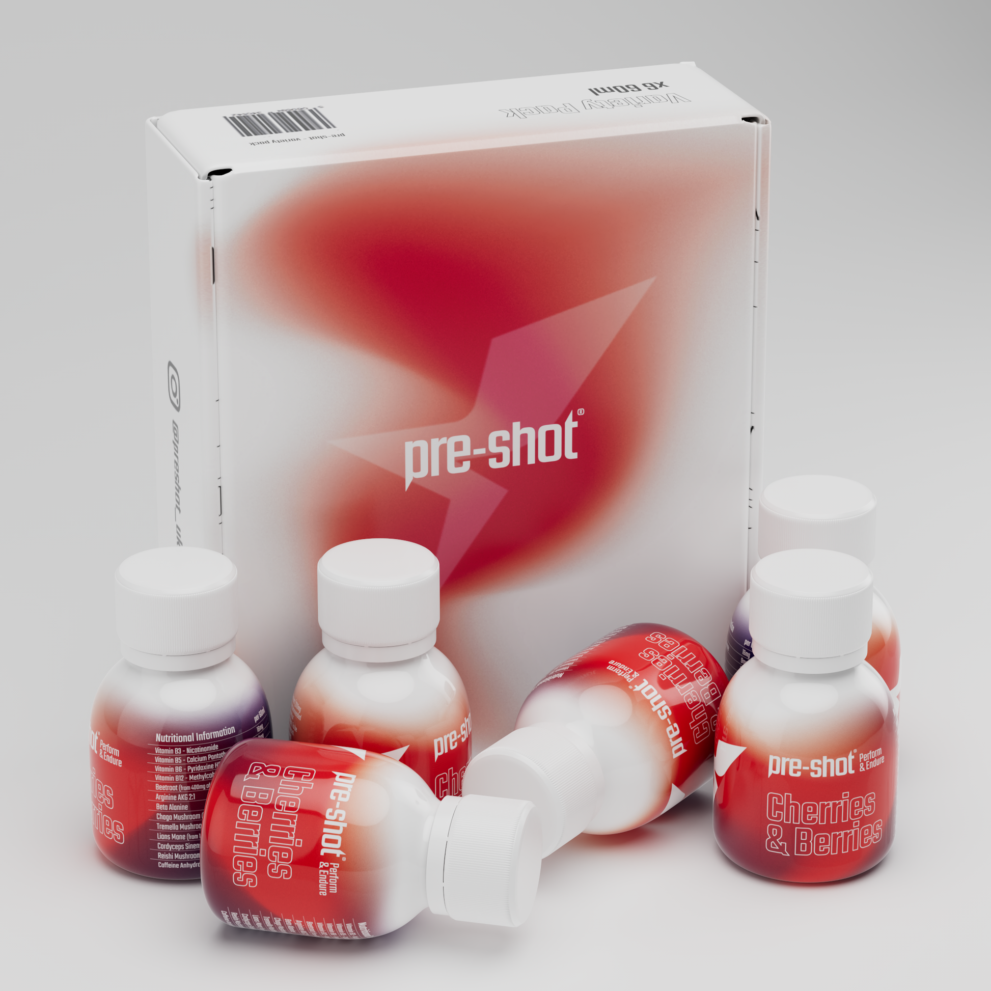 Pre-shot combines scientifically backed actives, mushrooms and vitamins to help increase physical energy, reduce fatigue and improve focus. Pre-shot is not your typical pre-workout, it targets body and mind, without side effects or energy crashes