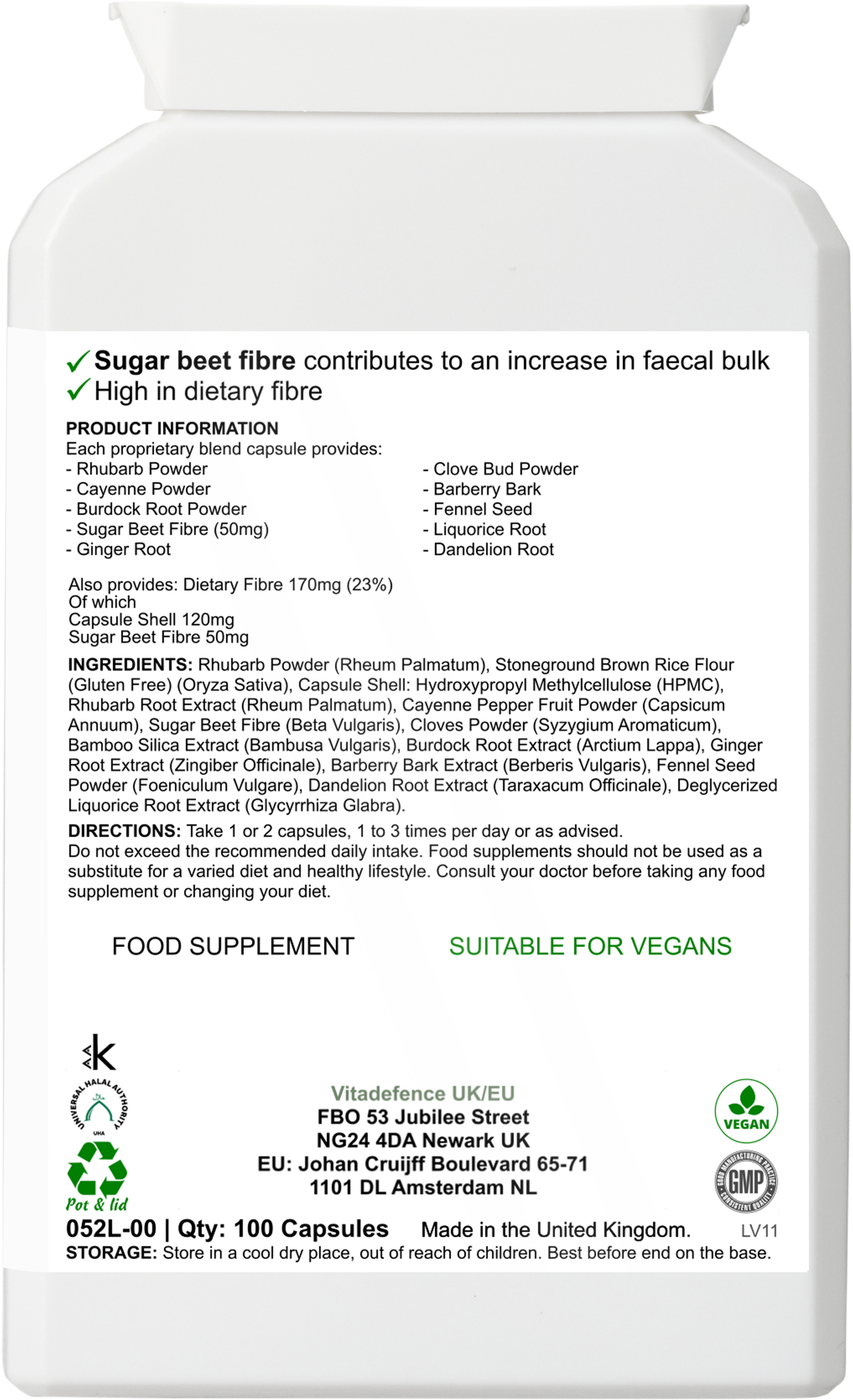 Vitadefence® Rhubarb Multi is a vegan capsule food supplement, manufactured in the UK to GMP standards. This high-fibre blend combines rhubarb, burdock, ginger, fennel seed, clove bud, cayenne, barberry bark, dandelion root, and sugar beet fibre.