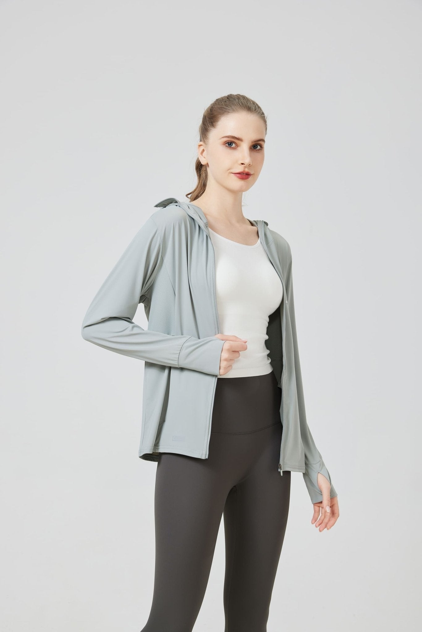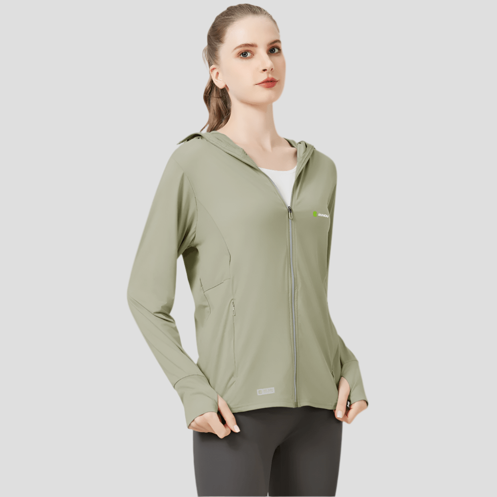 Stay cool, covered, and confident with the Sun Protective Jacket UPF 100, the BEST choice for sunny days and active lifestyles. Features an integrated hood, wide brim, and thumb holes to cover your head, neck, face, and hands entirely from harmful UV rays. Our women's sun protective jacket can be worn for cycling, running, hiking, climbing, fishing, volleyball, and more.