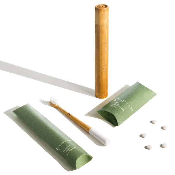 Our Truthbrush Sustainable Journey set has everything you need to start making a sustainable difference twice a day (and makes a great gift too). The set contains a Cloud White Truthbrush, a three month supply of Truthtabs - Wild Mint toothpaste tablets with fluoride, plus a beautiful bamboo travel case. The award-winning Truthbrush is carefully made from sustainably sourced bamboo with plant-based bristles & finished with plant oil for a smooth feel and water resistance. No lolly sticks here!. Truthtabs -award-winning zero waste toothpaste tablets, are made here in the UK from the finest ingredients. The tablets contain 1450 ppm fluoride as per dentist’s recommendations and are Wild Mint flavoured to leave teeth sparkling clean and breath fresh.